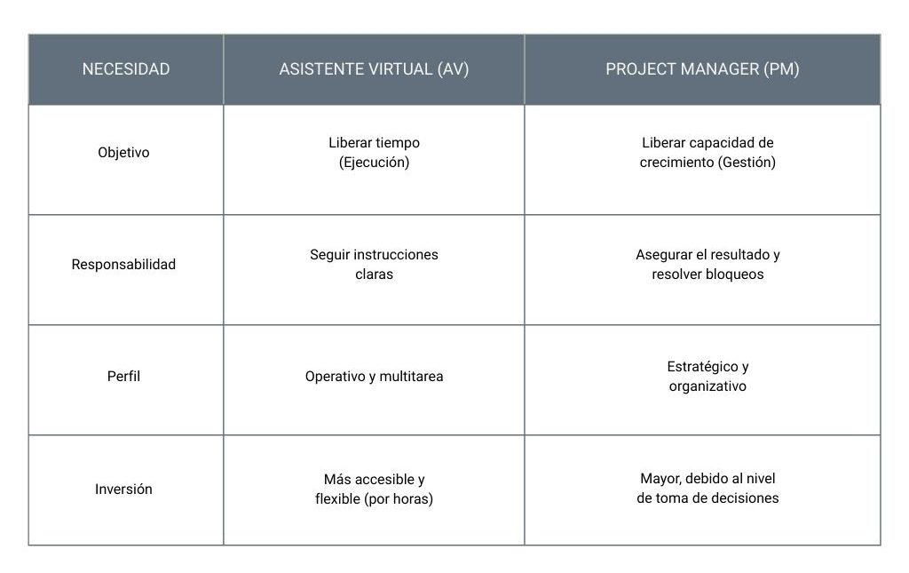 Delegar tareas con un AV te devuelve tu vida. Delegar la gestión con un PM te devuelve tu negocio. La clave está en identificar dónde está el verdadero bloqueo en este momento.
